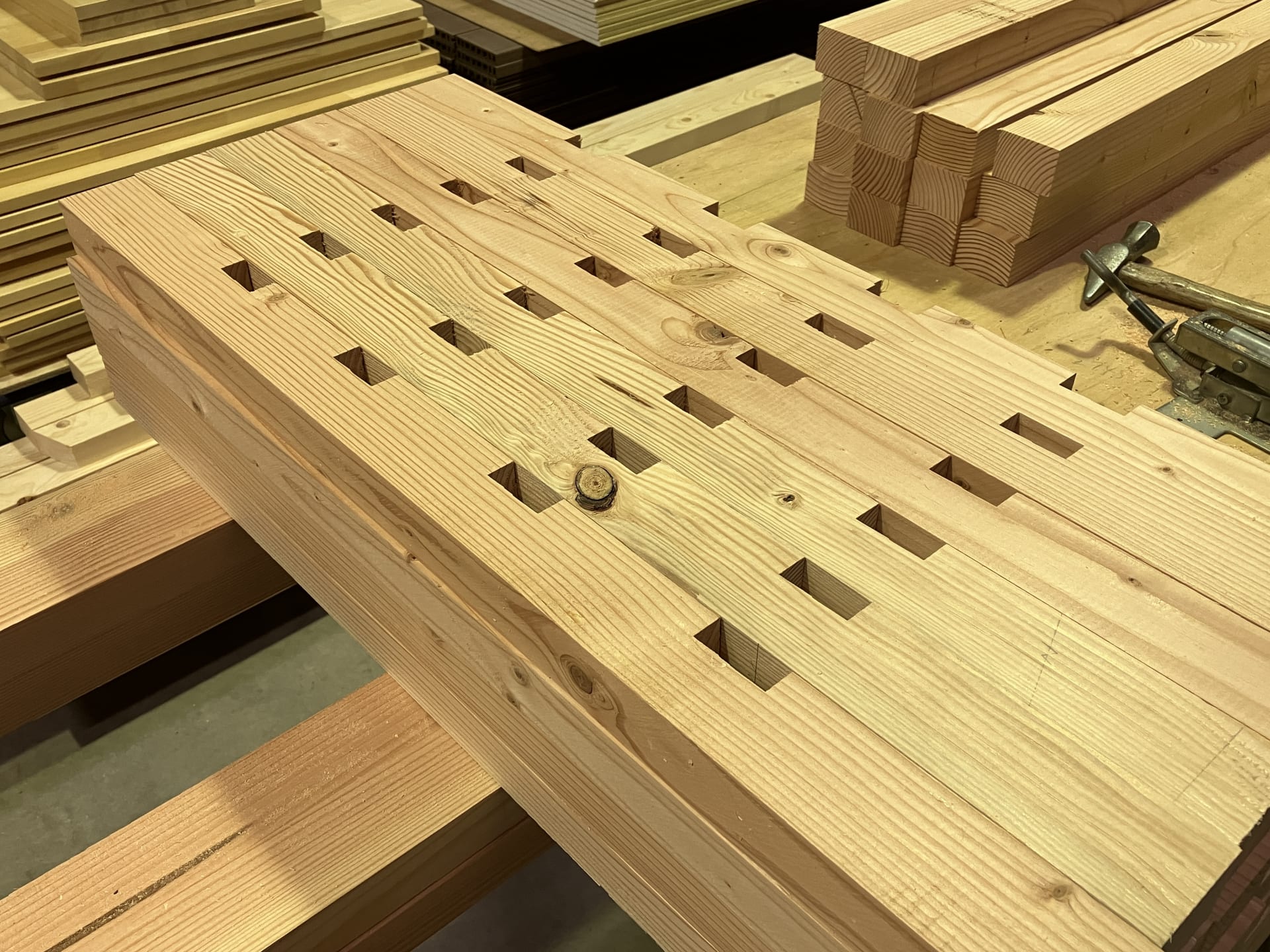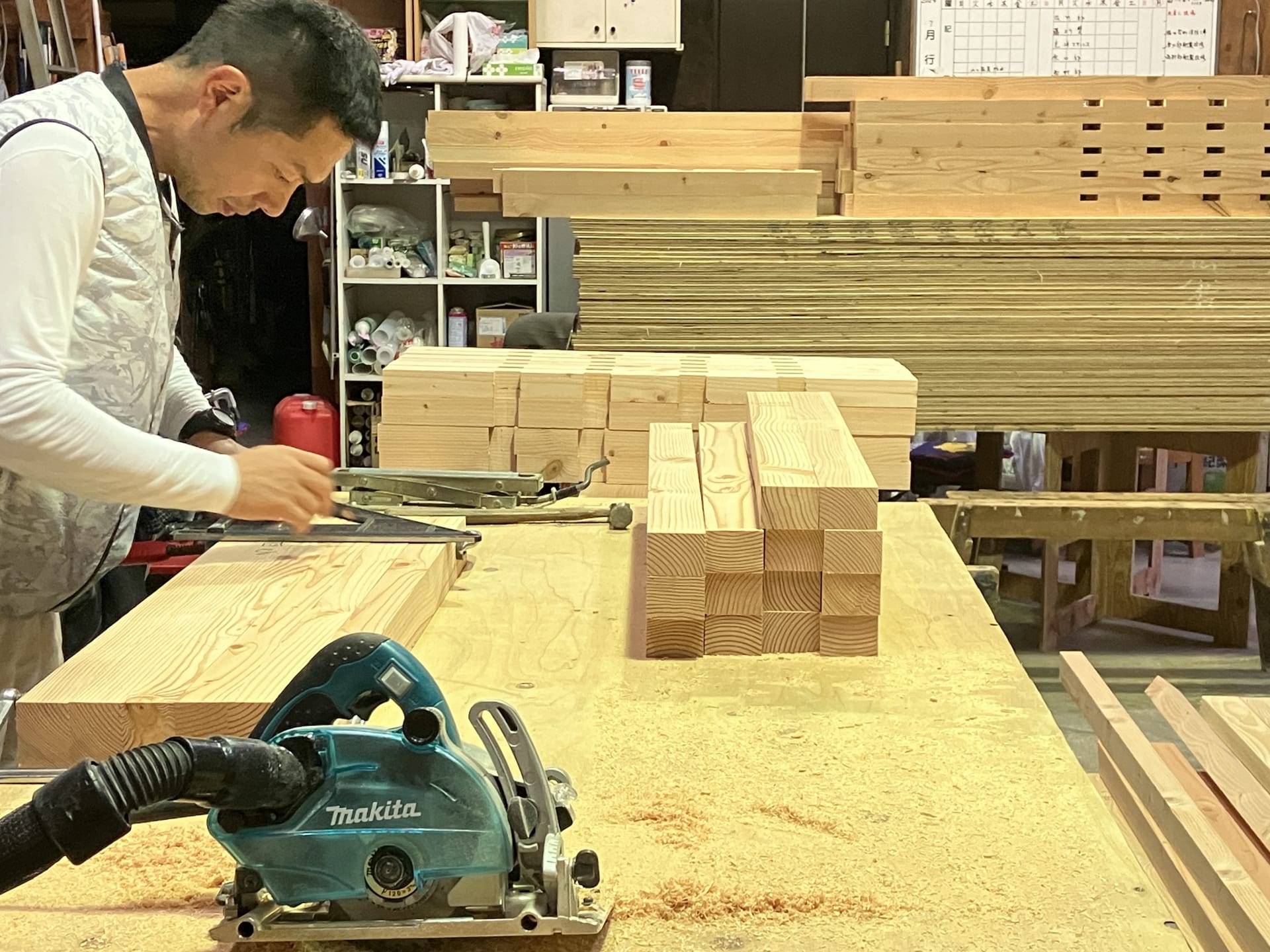 自社の工房でベテランの大工、古井さんが手刻みで丁寧に屋根の垂木部材を加工し、