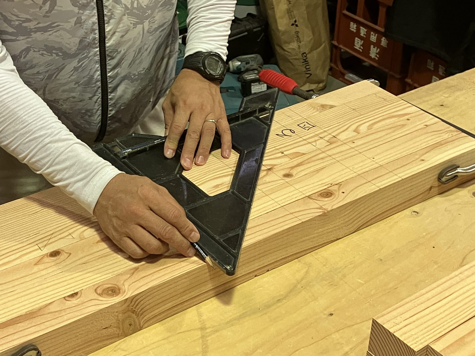 基礎工事に並行して、工房では大工さんが屋根垂木の加工、塗装を行っていました。