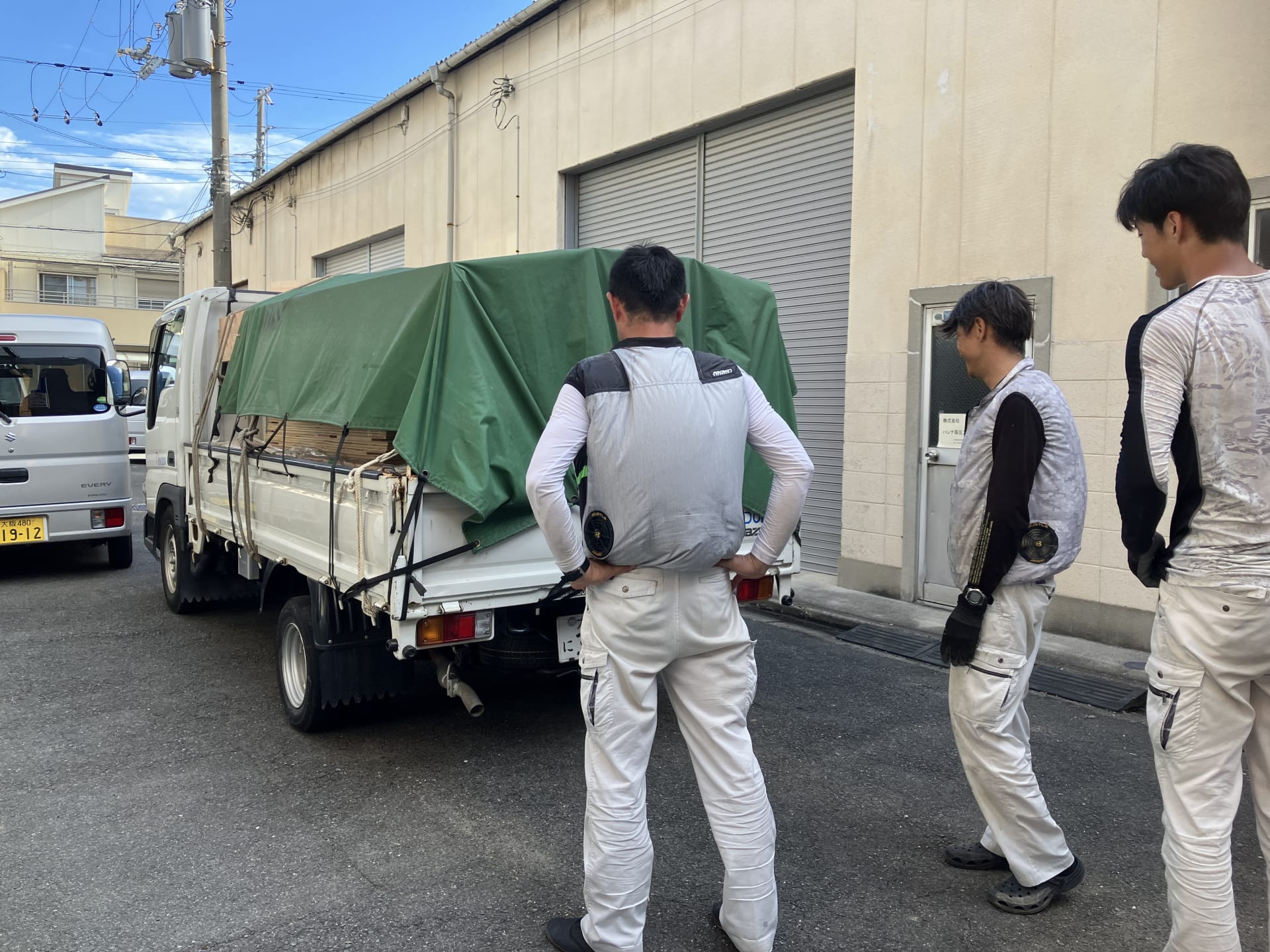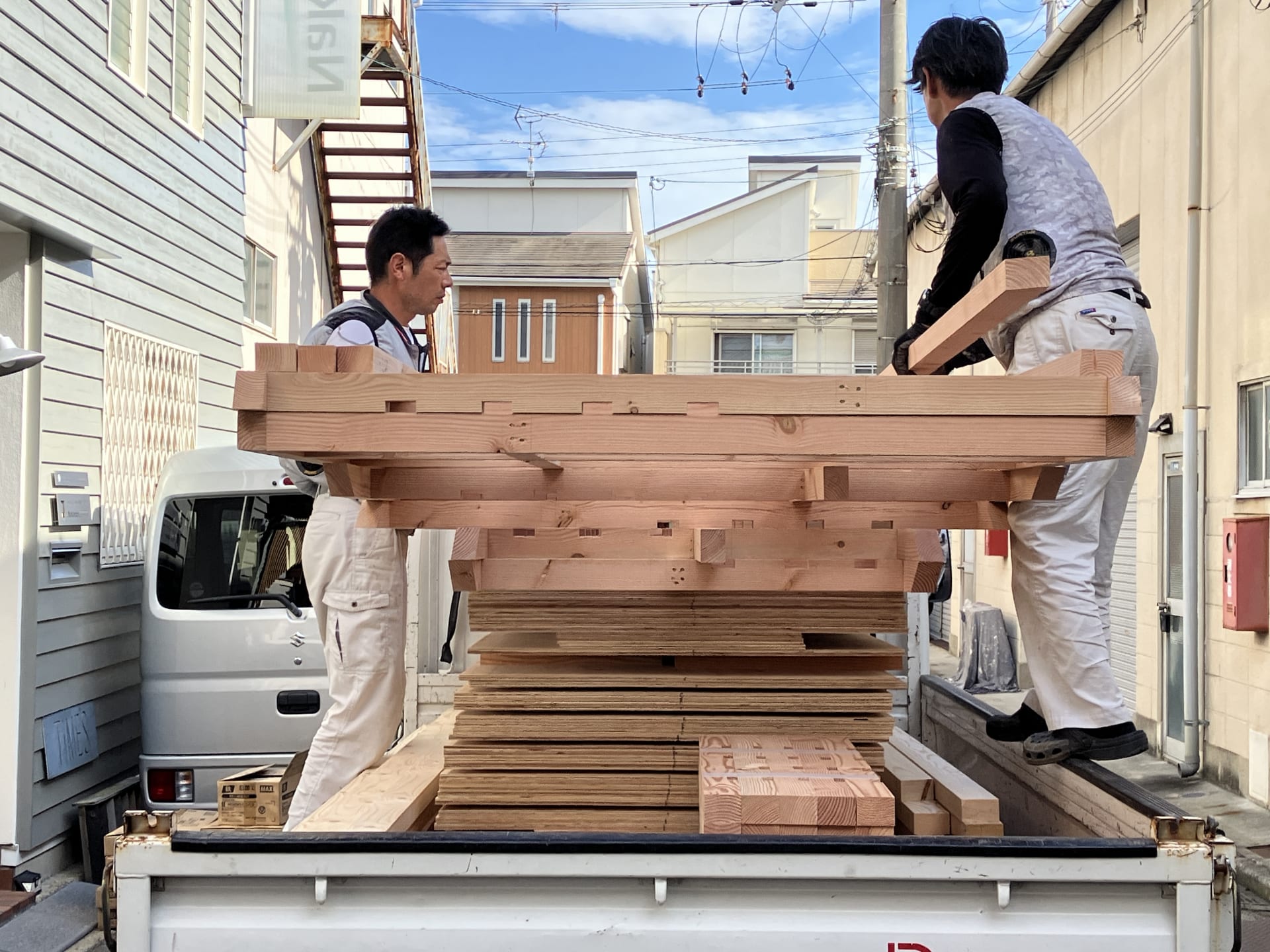 組み上げられた垂木材や合板材は、棟上げの現場に工房からトラックで運ばれます。
