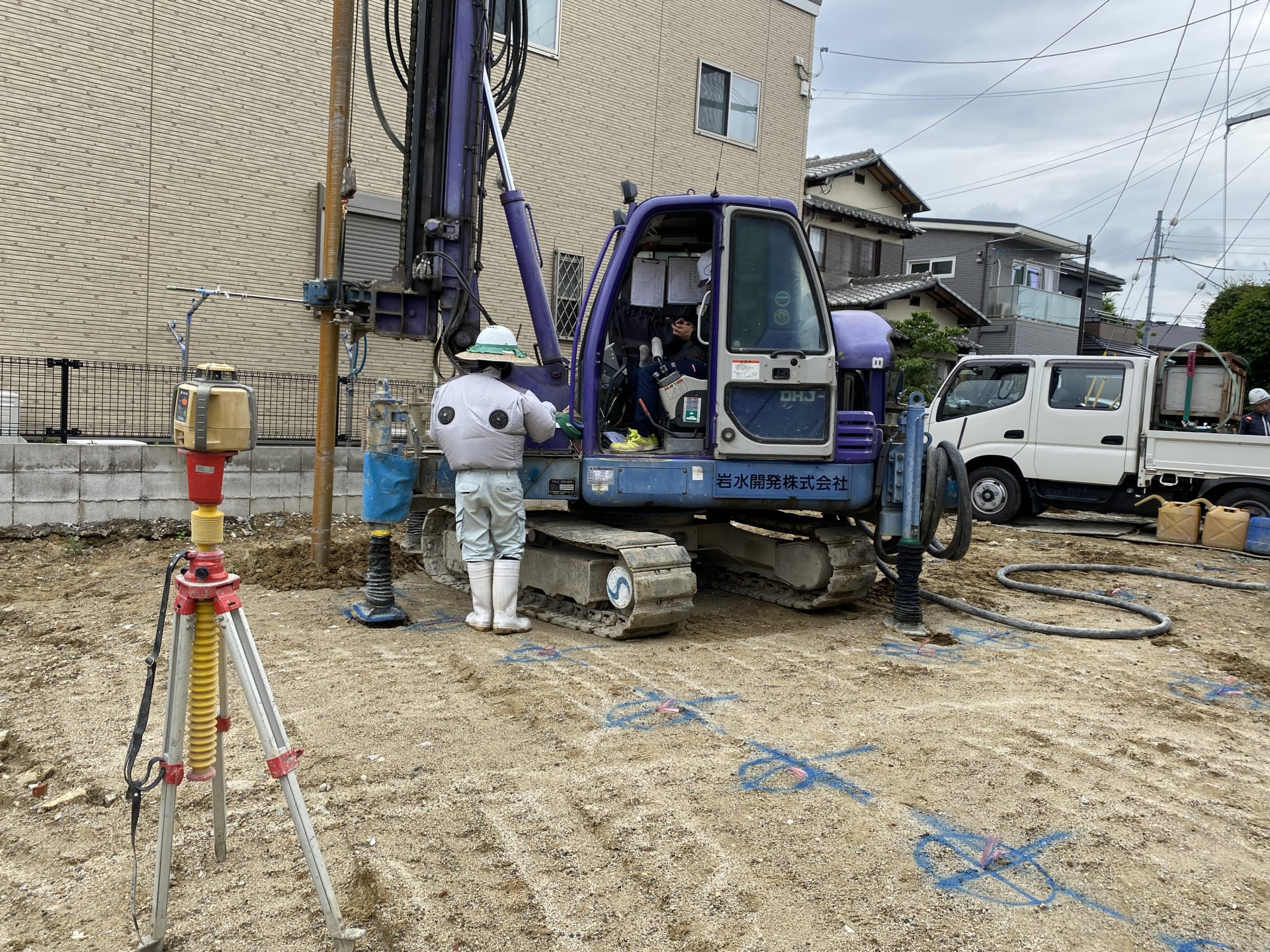 大昔に盛り土されたと思われる表面2m近くが軟弱な地盤であるため、必要な箇所に柱状地盤改良と呼ばれる地盤改良を施しました。