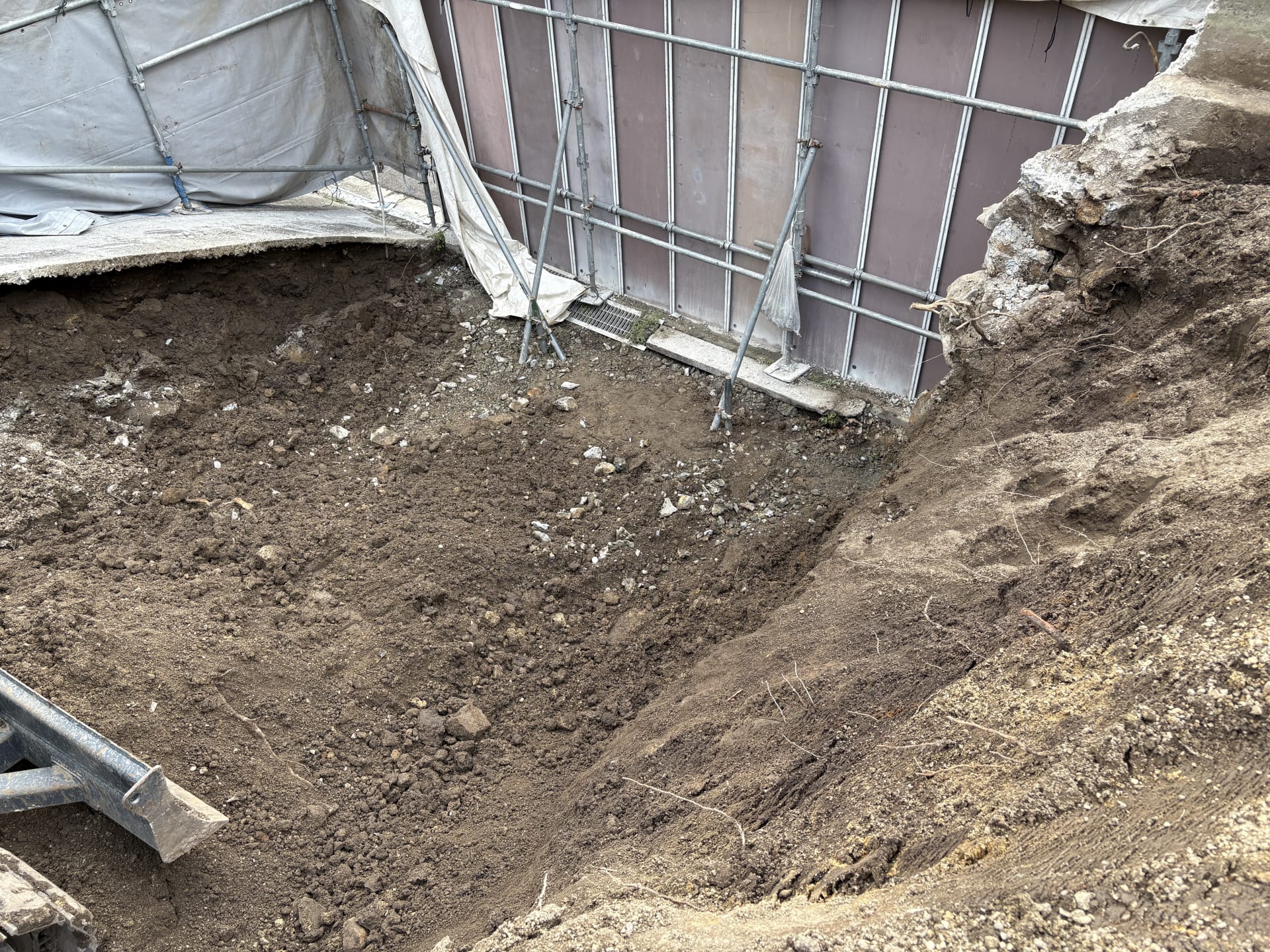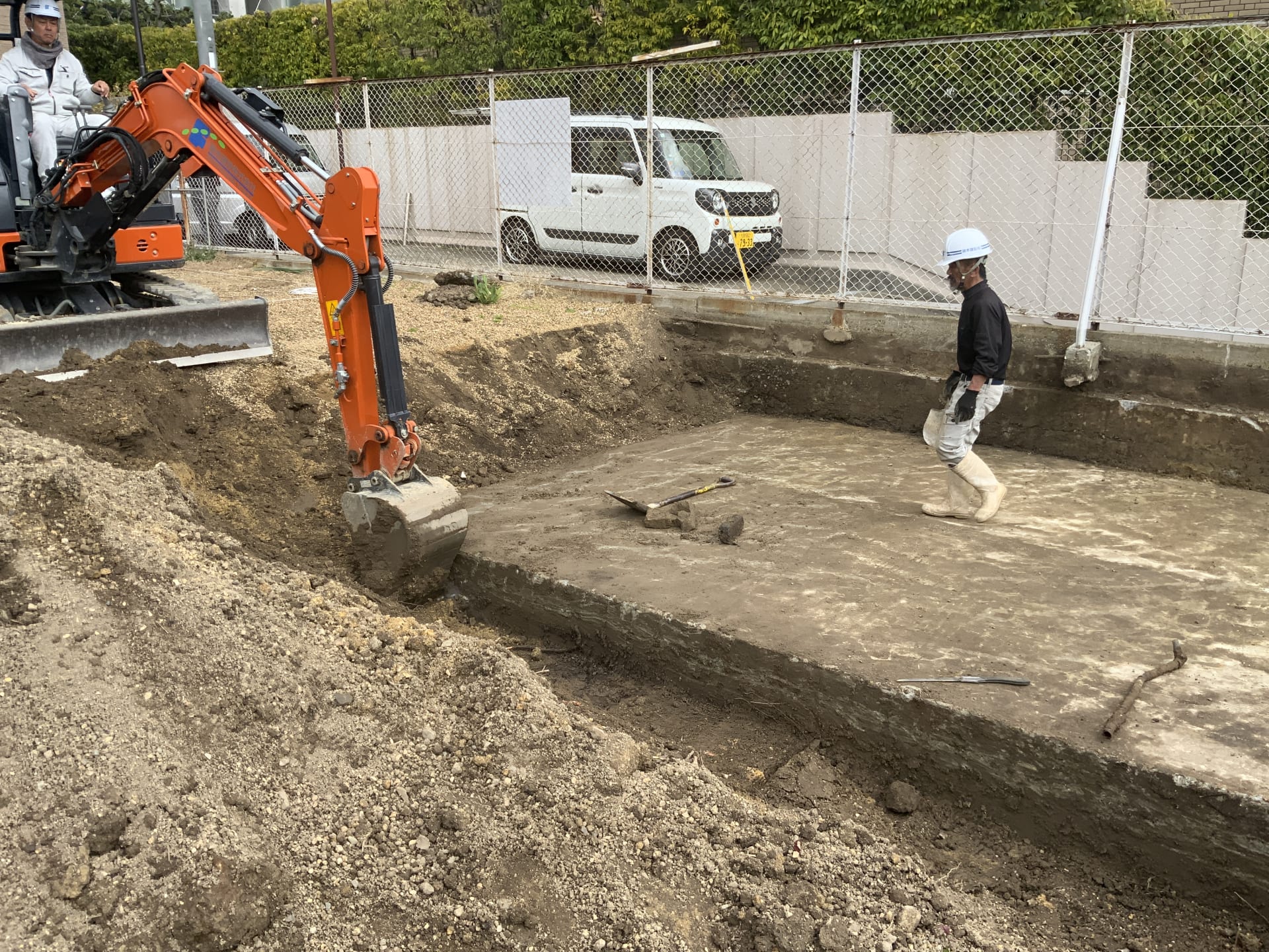 ある深さまでは敷地が現代になって造成されたときの浅い地層のため、重機で大胆に掘ります。