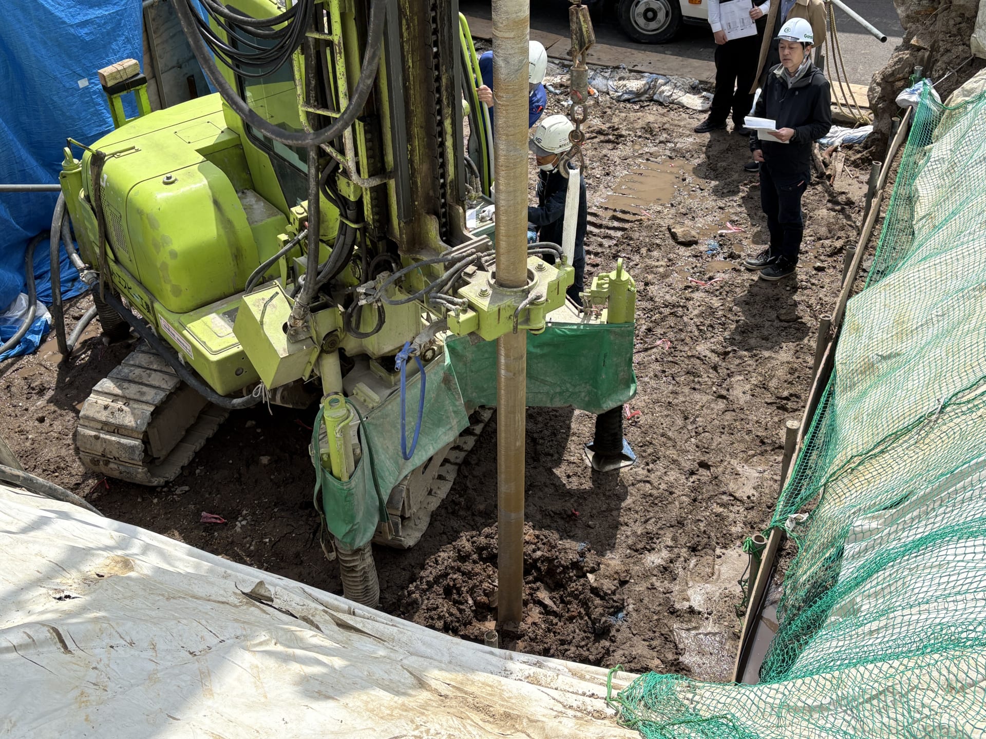 表面地盤がそこまで頑強ではないことや、既存の擁壁に荷重を負担させないため、コスト的にも目途の立つ柱状地盤改良工事を施します。地下の解体が完了した後の地面に重機を入れ、所定の間隔でドリルで穴を掘り、ドリルの先端から出てくる液体のセメントと土を混ぜ合わせながらドリルを地面から抜くことで、柱状の固い杭ができます。