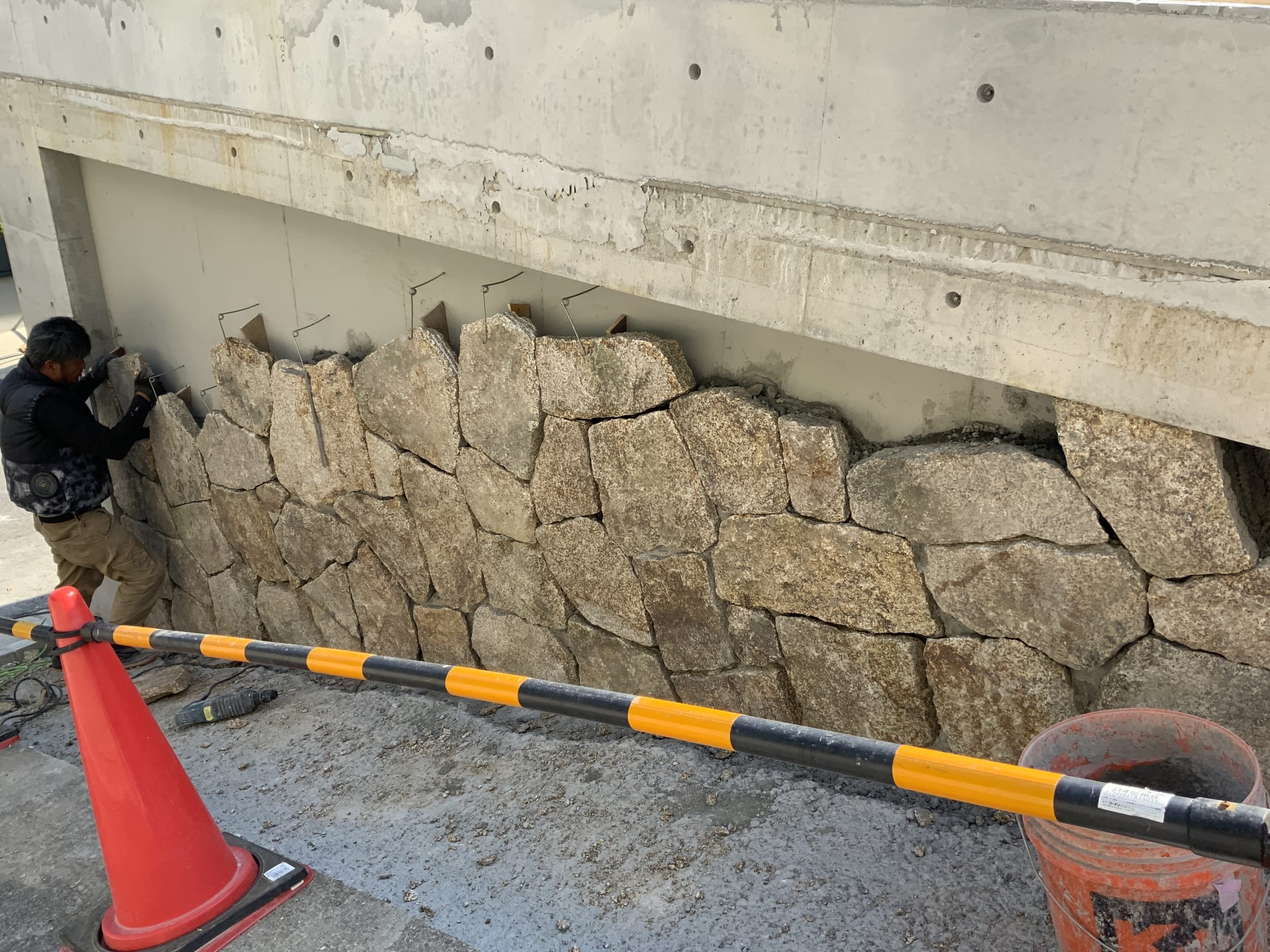 ▲ 景観地域の街並みに合わせて、コンクリートで作った基礎の側面は石貼りに。形を整えつつ、隙間が大きくならないように積み上げていきます。