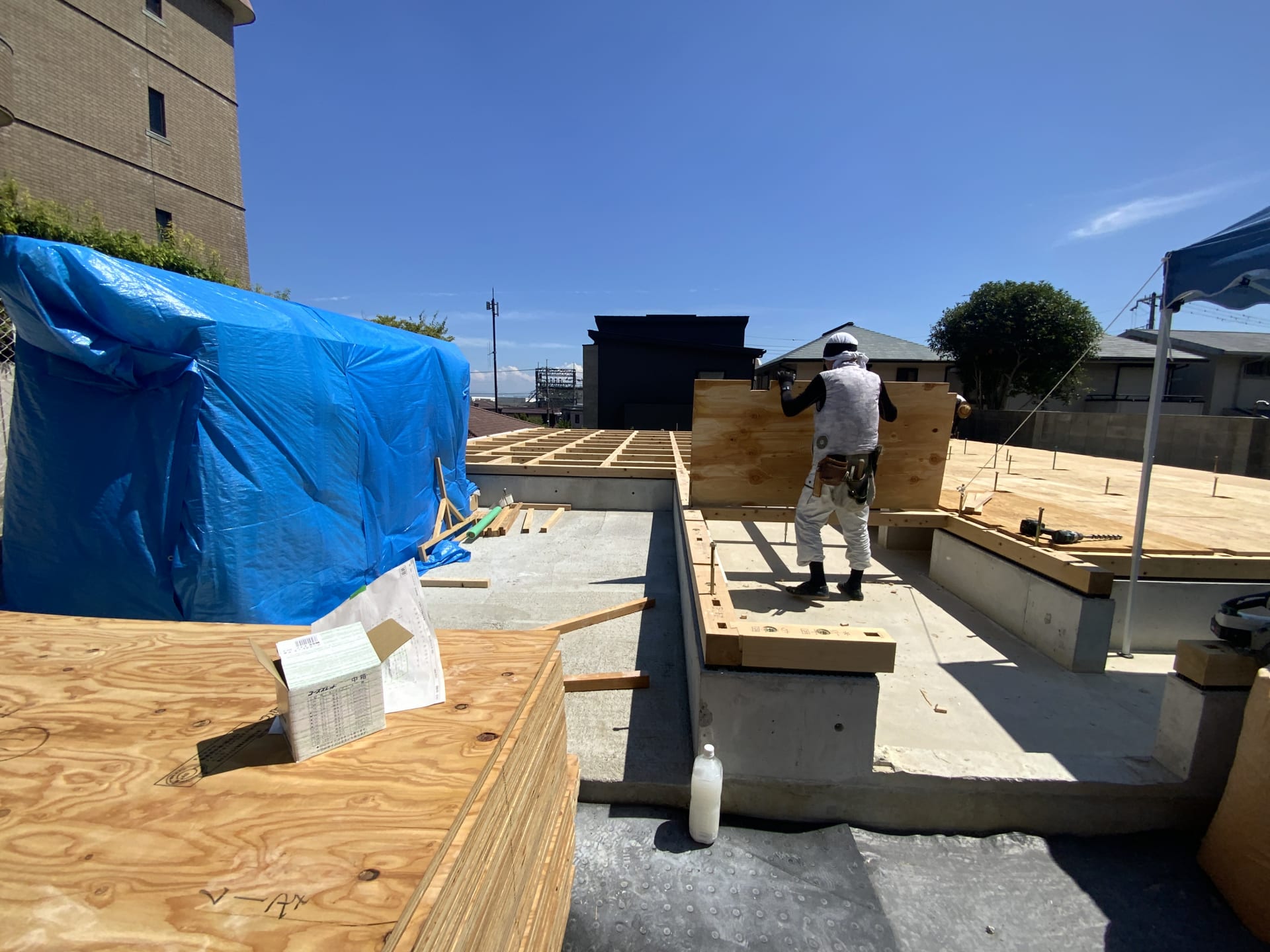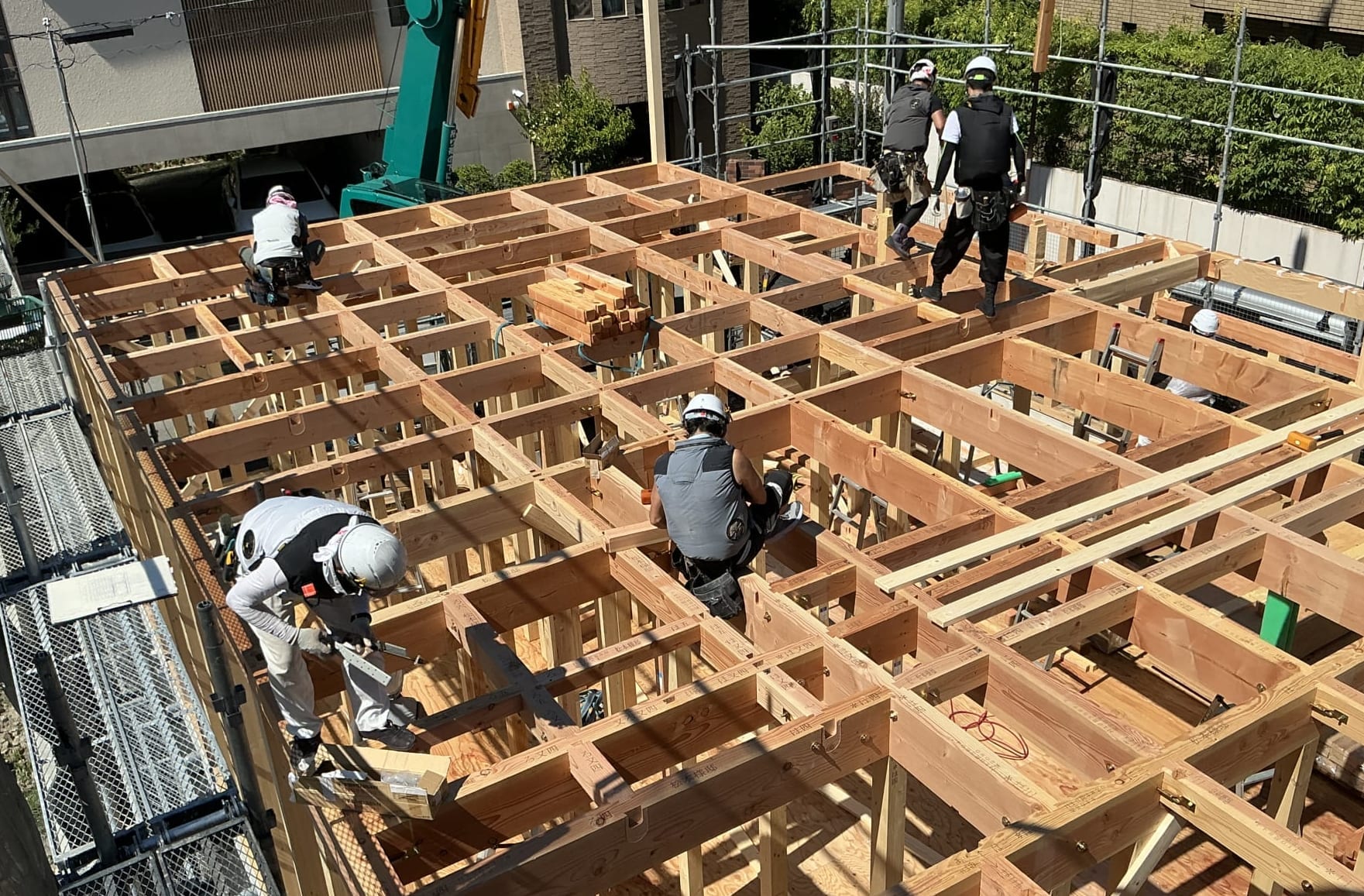 ▲ 二階の床の形がおおよそ見えてきました。200㎡を超える住宅の建て方は7人がかりです。