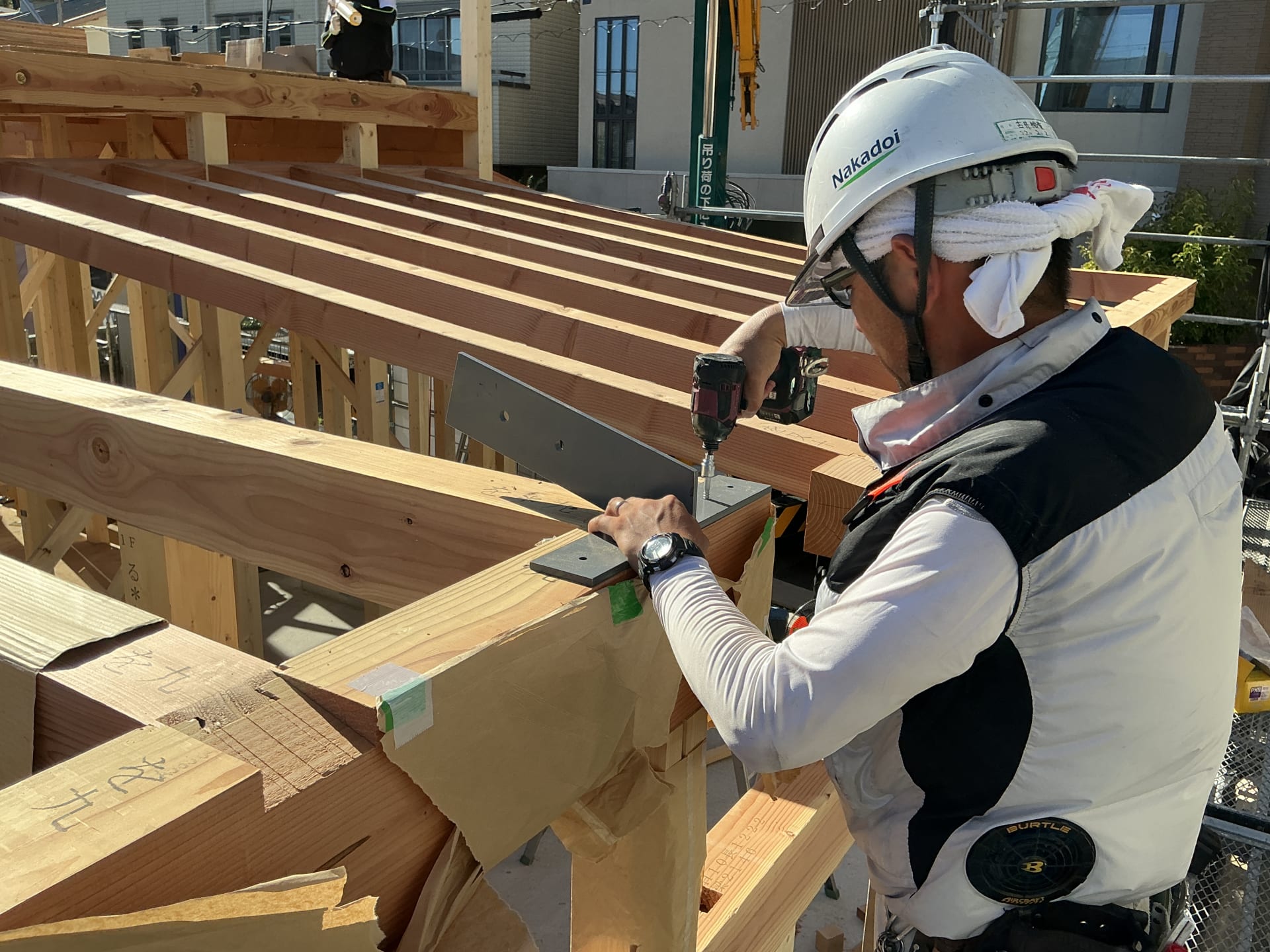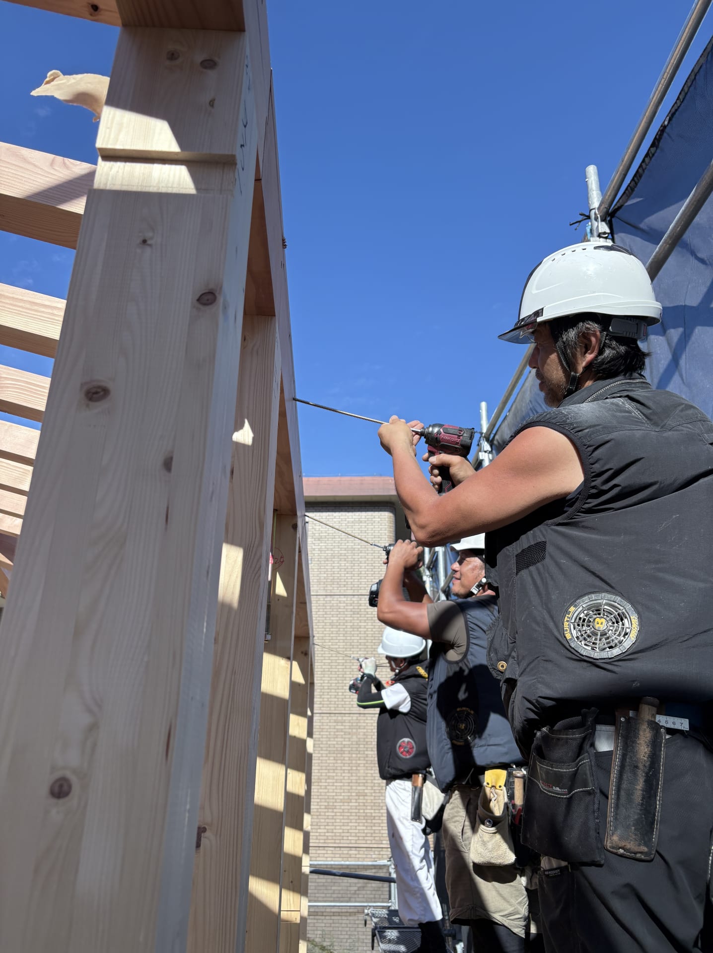 ▲ 現しの登り梁は、住空間に金物が露出しないよう、また、金属が熱を内外に伝える熱橋(ねっきょう)とならないようにSYNEGIC社の専用のビスを露出しないように打ち付けて固定していきます。個所数が多いので、大勢で一斉に打ち込んでいきます。