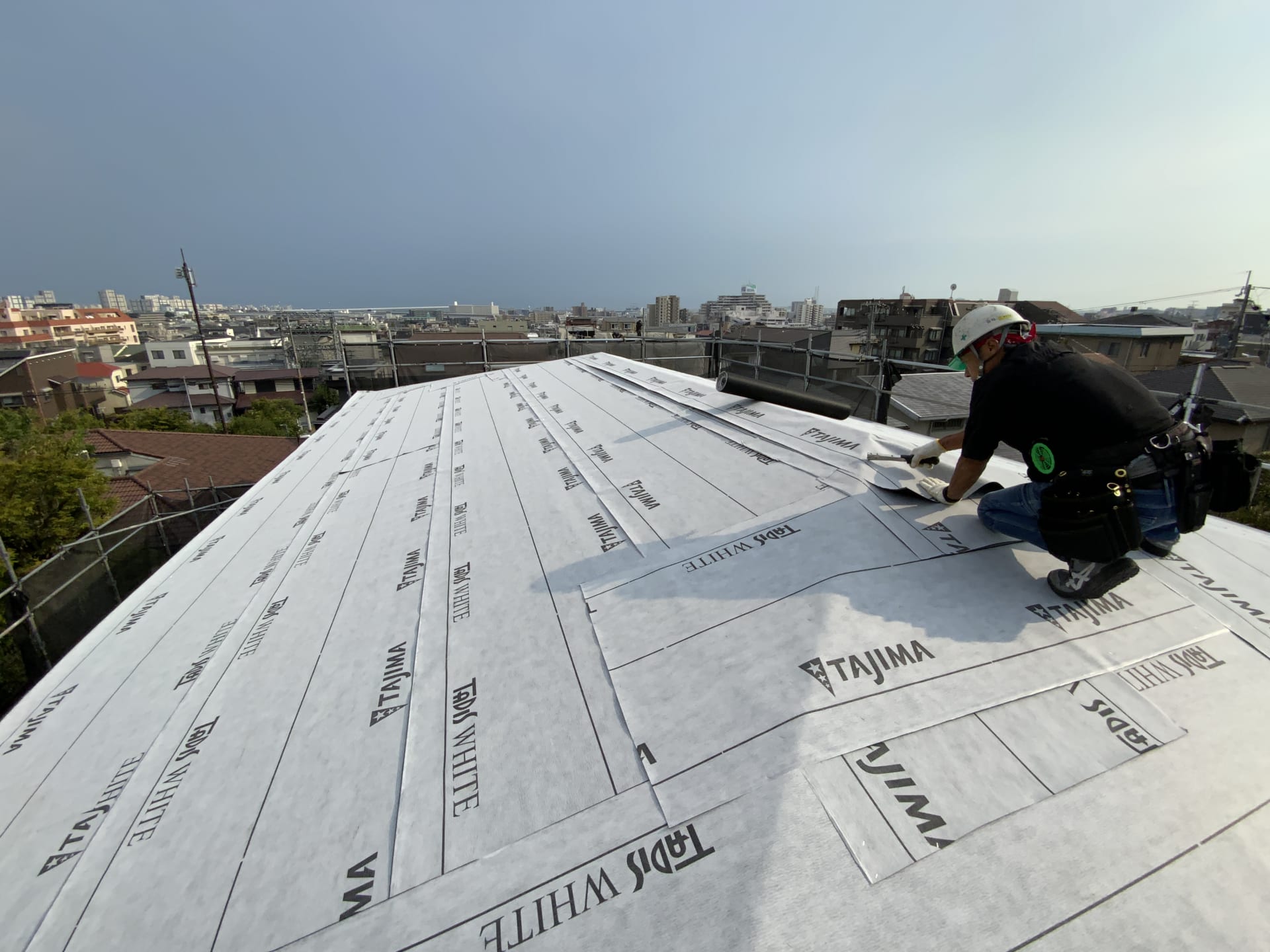 ▲ 組みあがった躯体が雨に濡れないように、通気垂木の上に野地板を敷き、改良アスファルトルーフィング(屋根の防水材)を敷き詰めます。