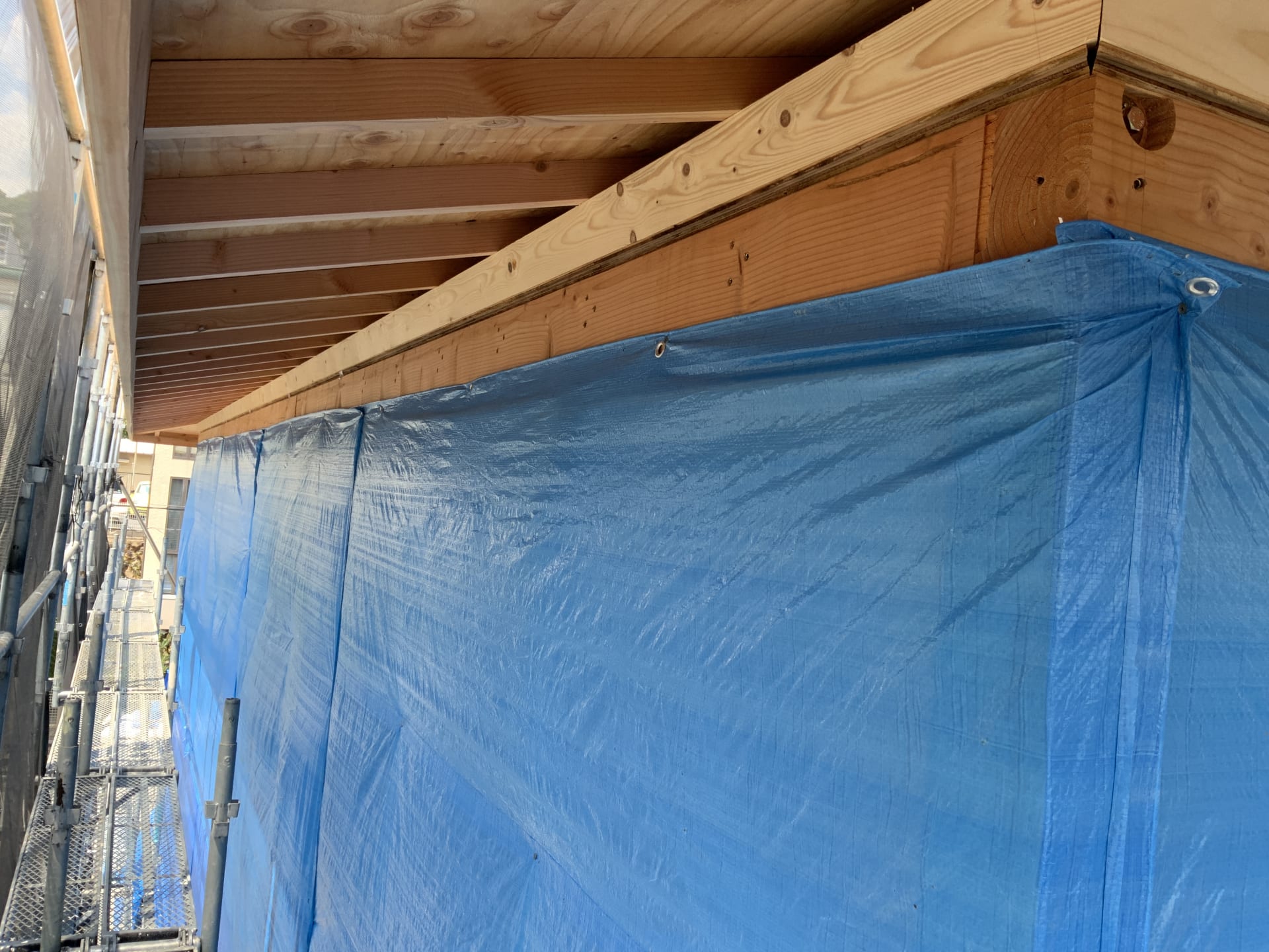 ▲ 壁についても雨が内部に入らない様、養生シートで全体をカバーします。
