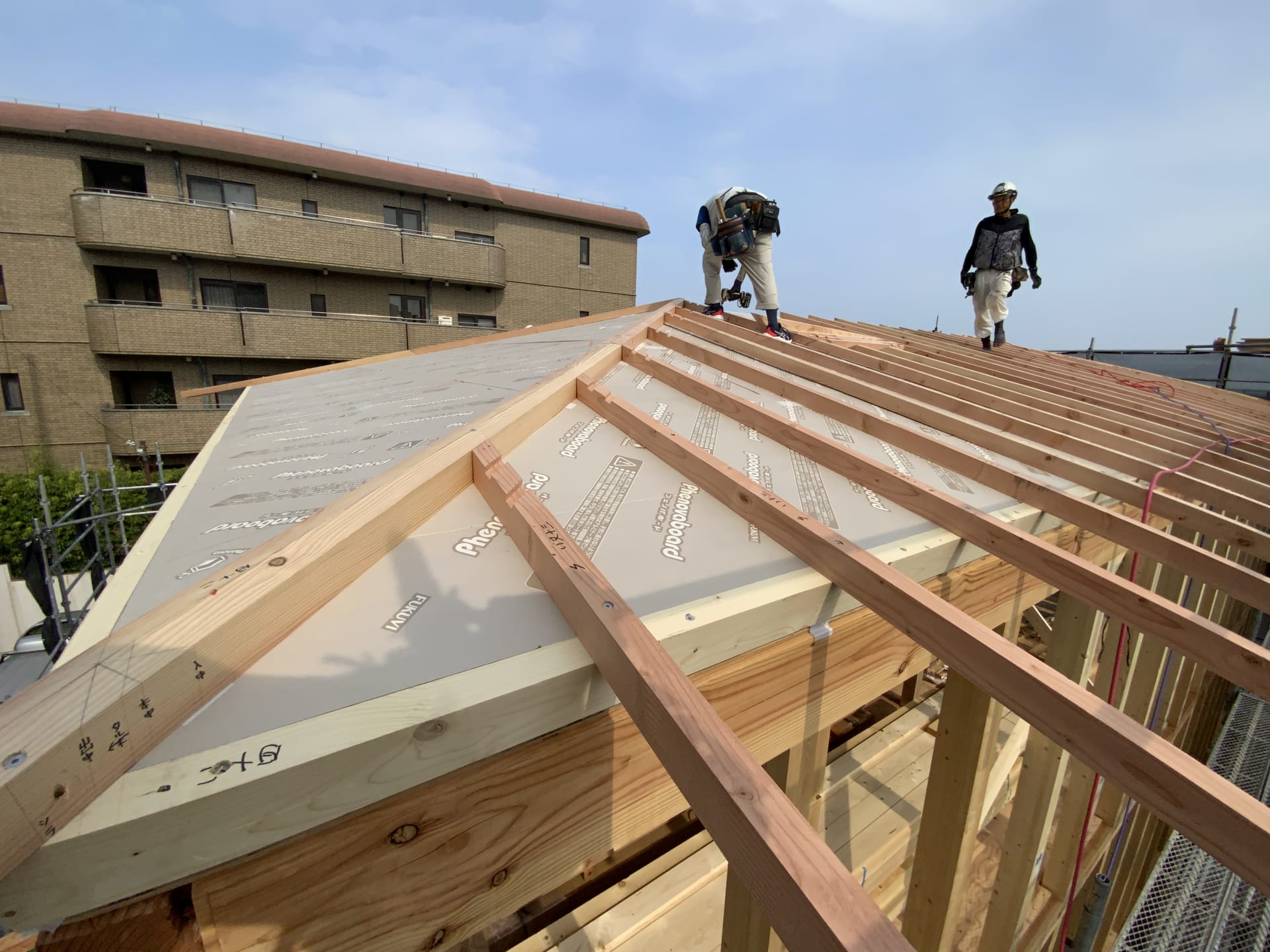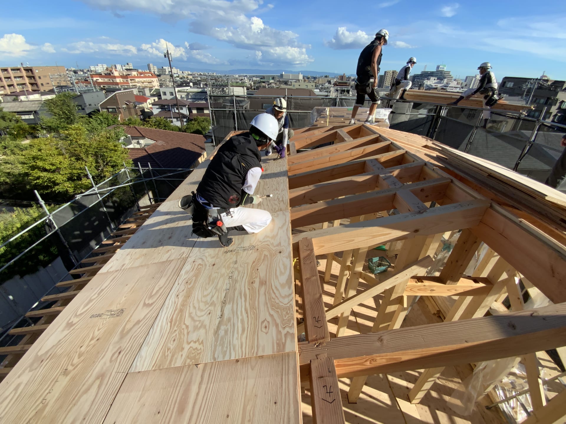 ▲ 組みあがった屋根の上に24mmの構造用合板を専用ビスで固定し、剛床(ごうしょう)を形成します。こちらのお住まいは許容応力度計算による耐震等級3、耐震性の最高グレードです。