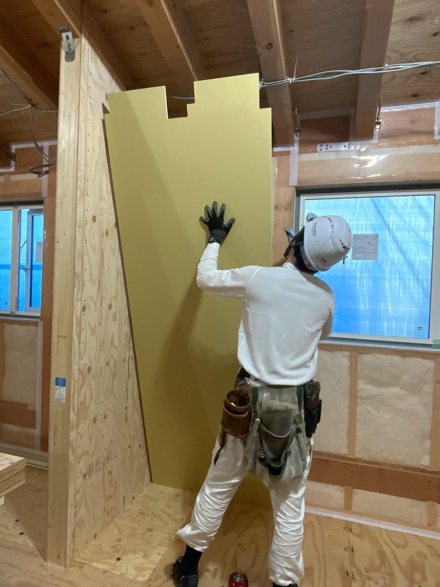 高性能グラスウールを壁の中に充填し、室内の湿気を壁の中に入れないためのシートを隙間なく貼ります。シートの境目はすべてテープで隙間なく埋め、その上から隙間なく壁の下地材を貼り上げていきます。梁の形に複雑に切り欠く、技量が必要となる工事です。