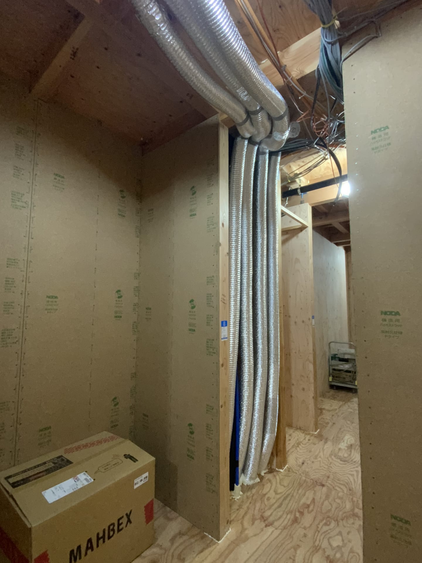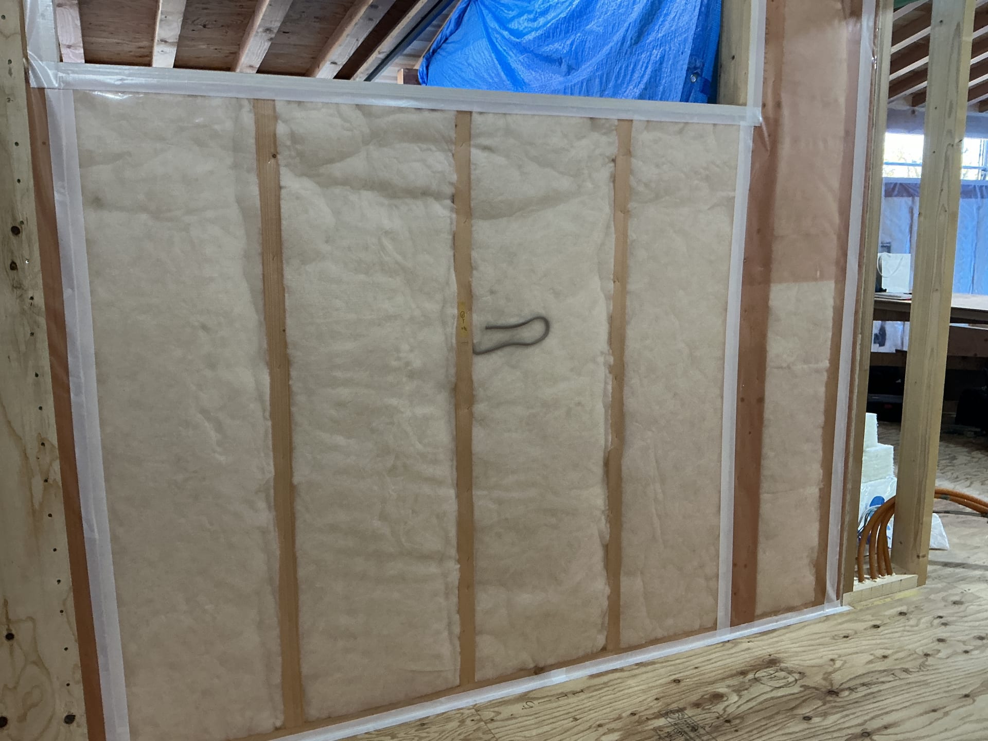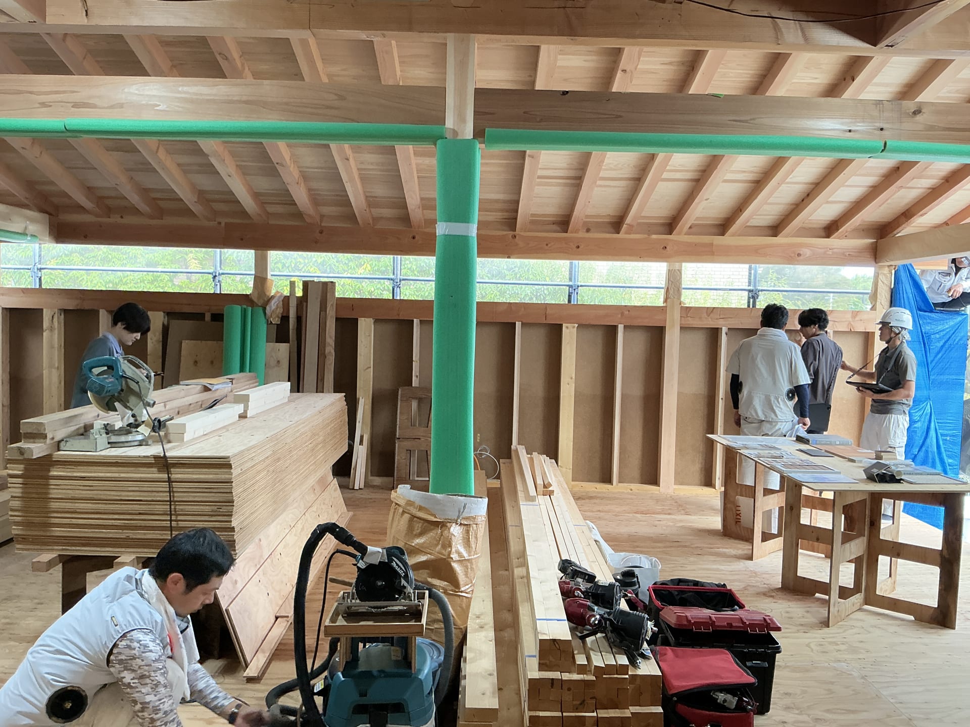 ▲柱梁などの構造は現しの仕上がりになるため、緑色のカバーで養生をして、傷がつかないように保護します。外周壁に構造となる合板を張ったのち、断熱工事へと進んでいきます。