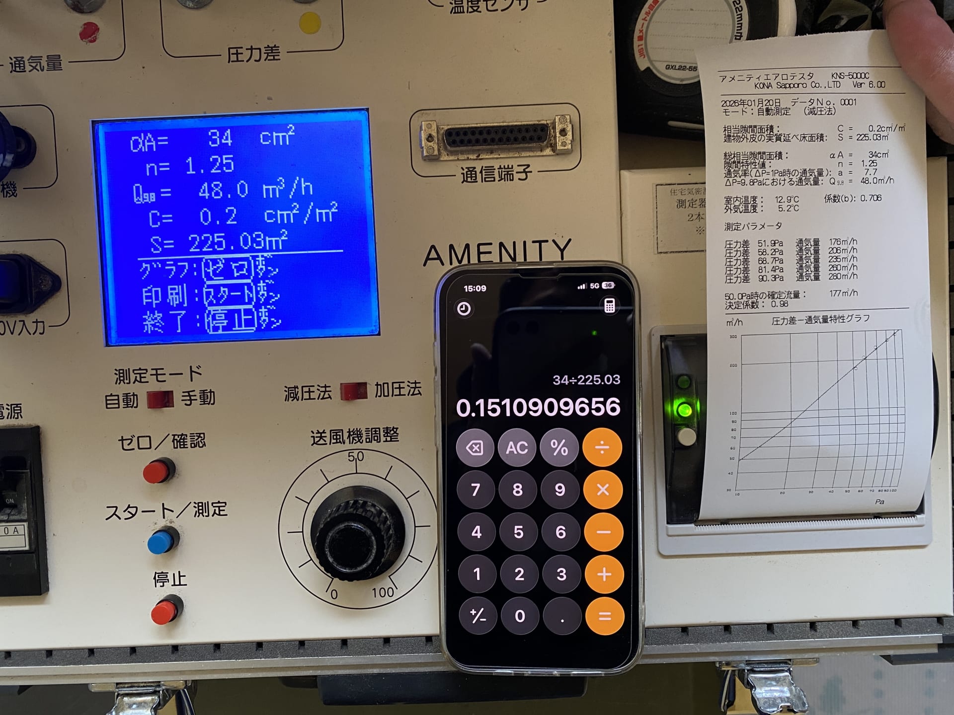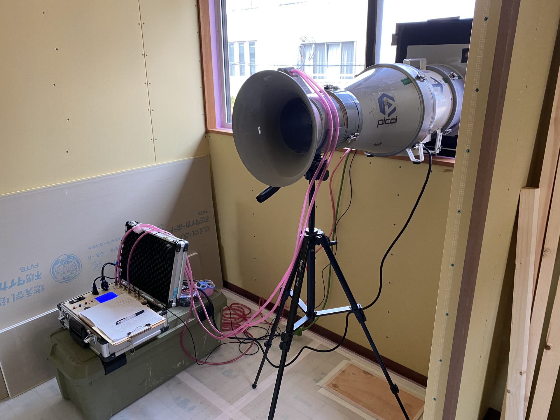 ▲気密検査も実施しました。メガホンのような機器の中にはプロペラが内蔵されており、このプロペラで室内の空気を外に押し出します。その際、密閉性の高い家だとプロペラが回りづらくなり、数値が測定されます。