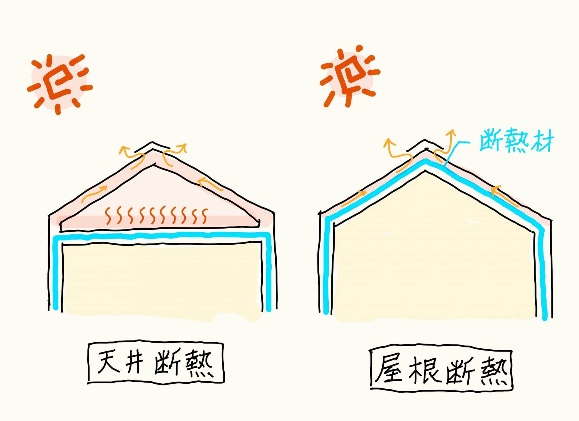屋根断熱(右図)では、屋根面で断熱が完結するため、室内の小屋裏に熱い空気がたまる心配もありませんし、屋根勾配を住空間に取り込むことも可能に。