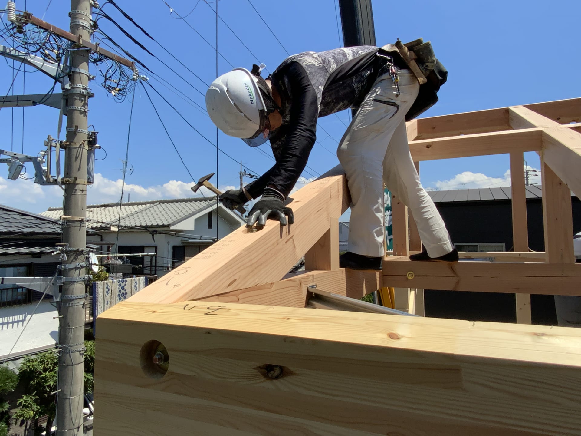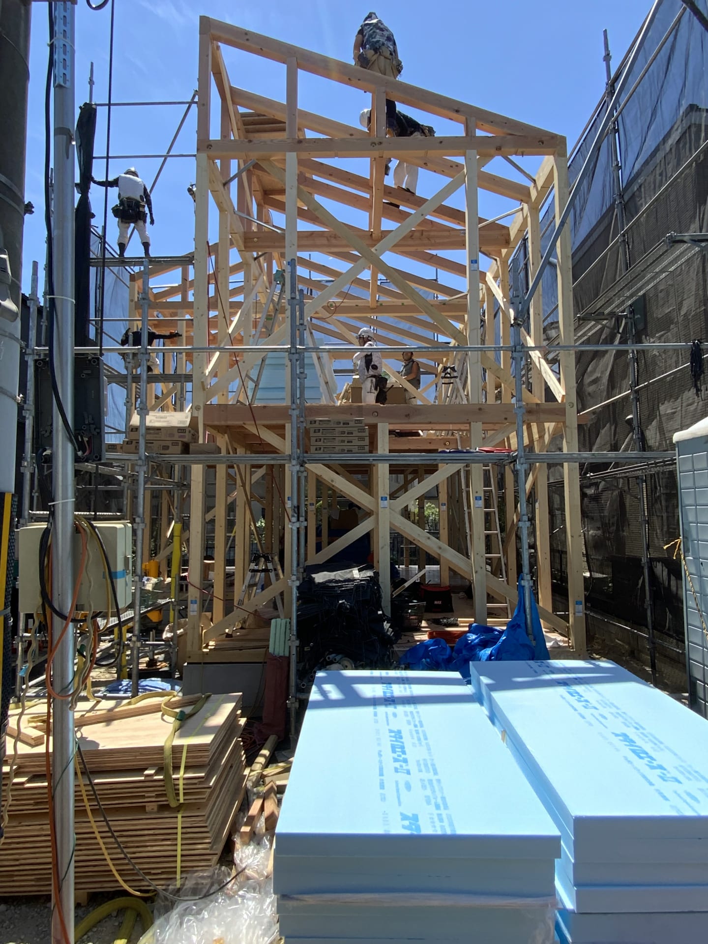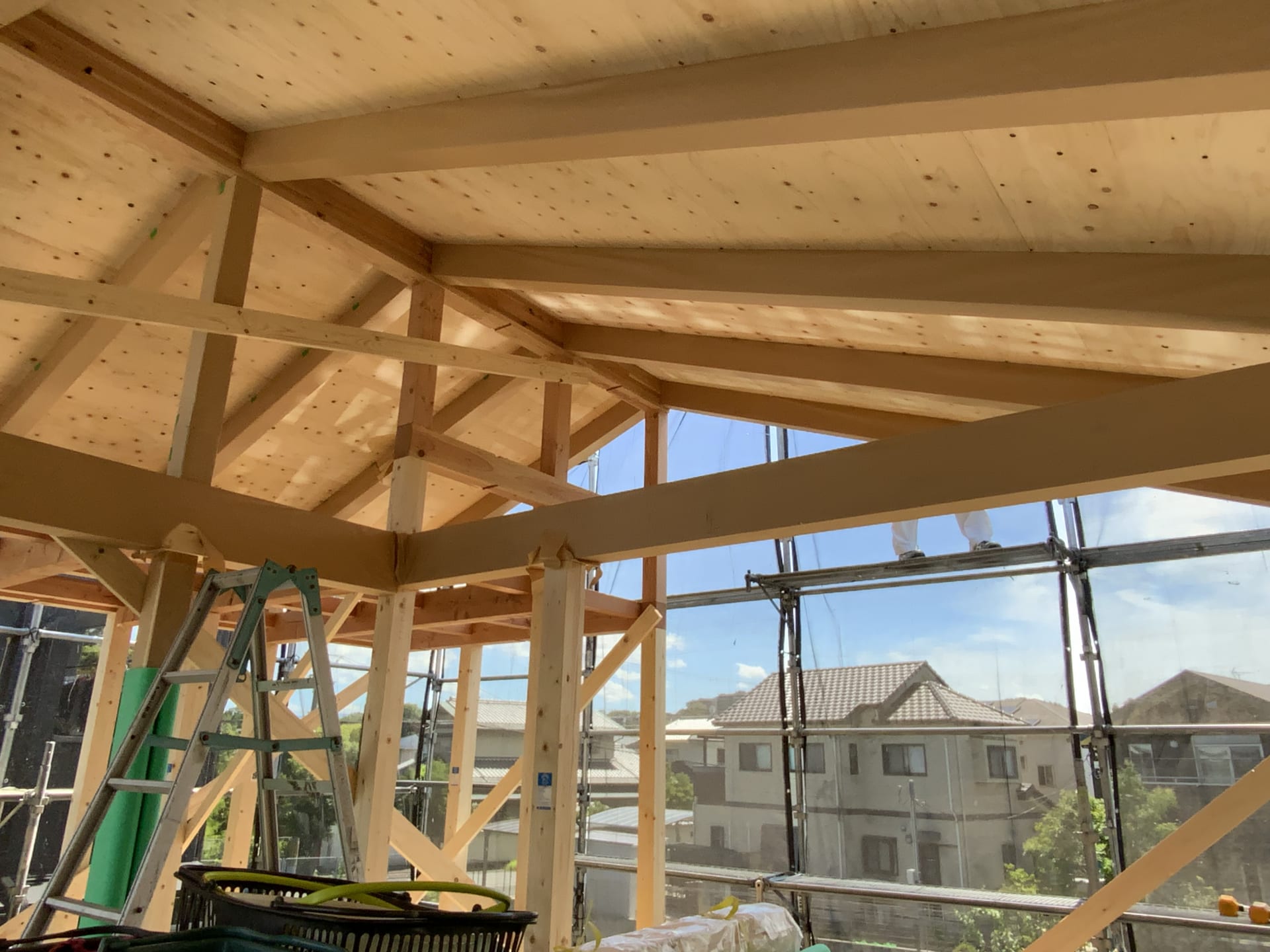 こうして、無事に建て方が完了いたしました。大工さんたち、炎天下の中お疲れさまでした。