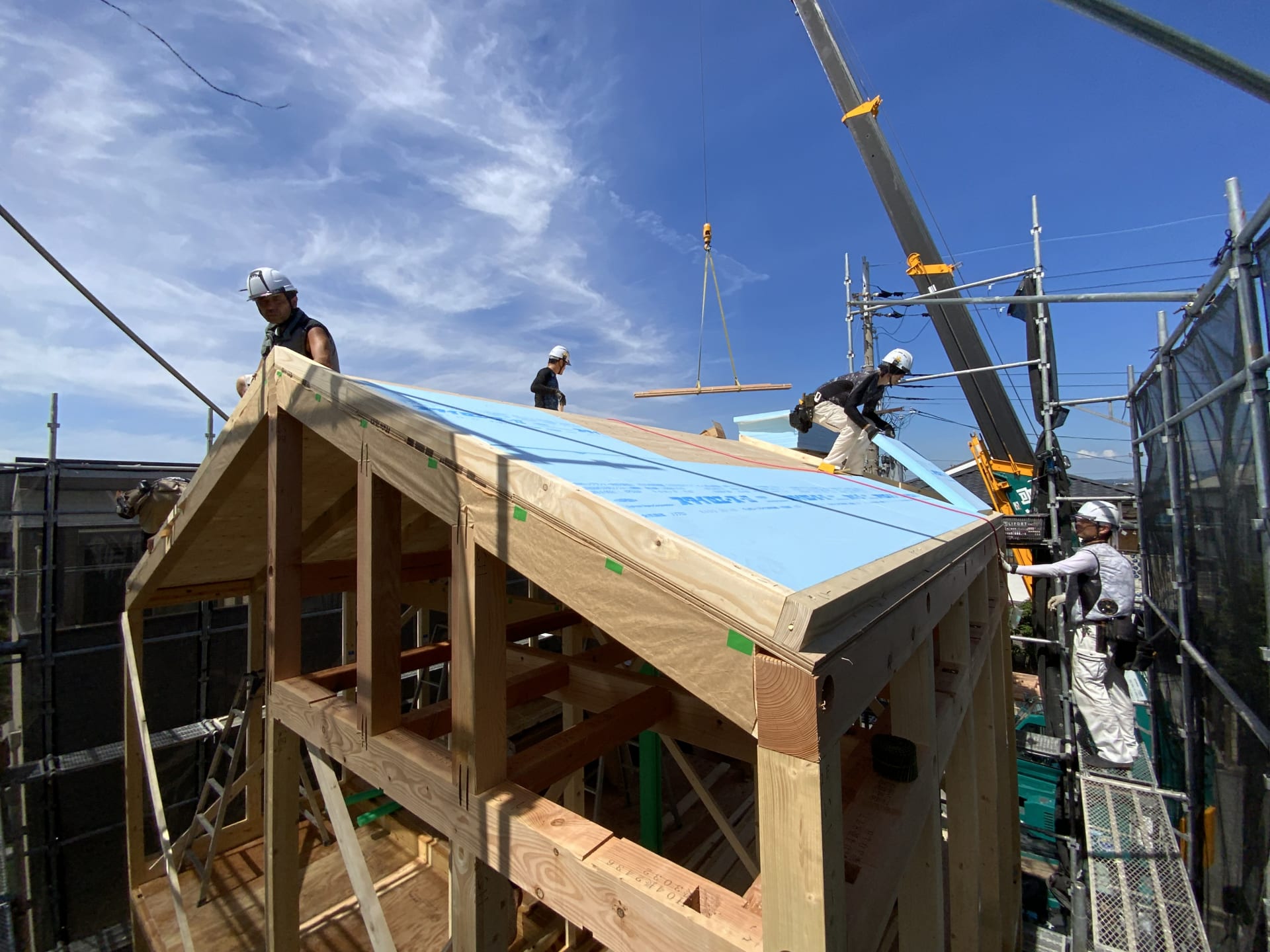 雨に濡れないよう、この後、養生までして棟上げは終了です。