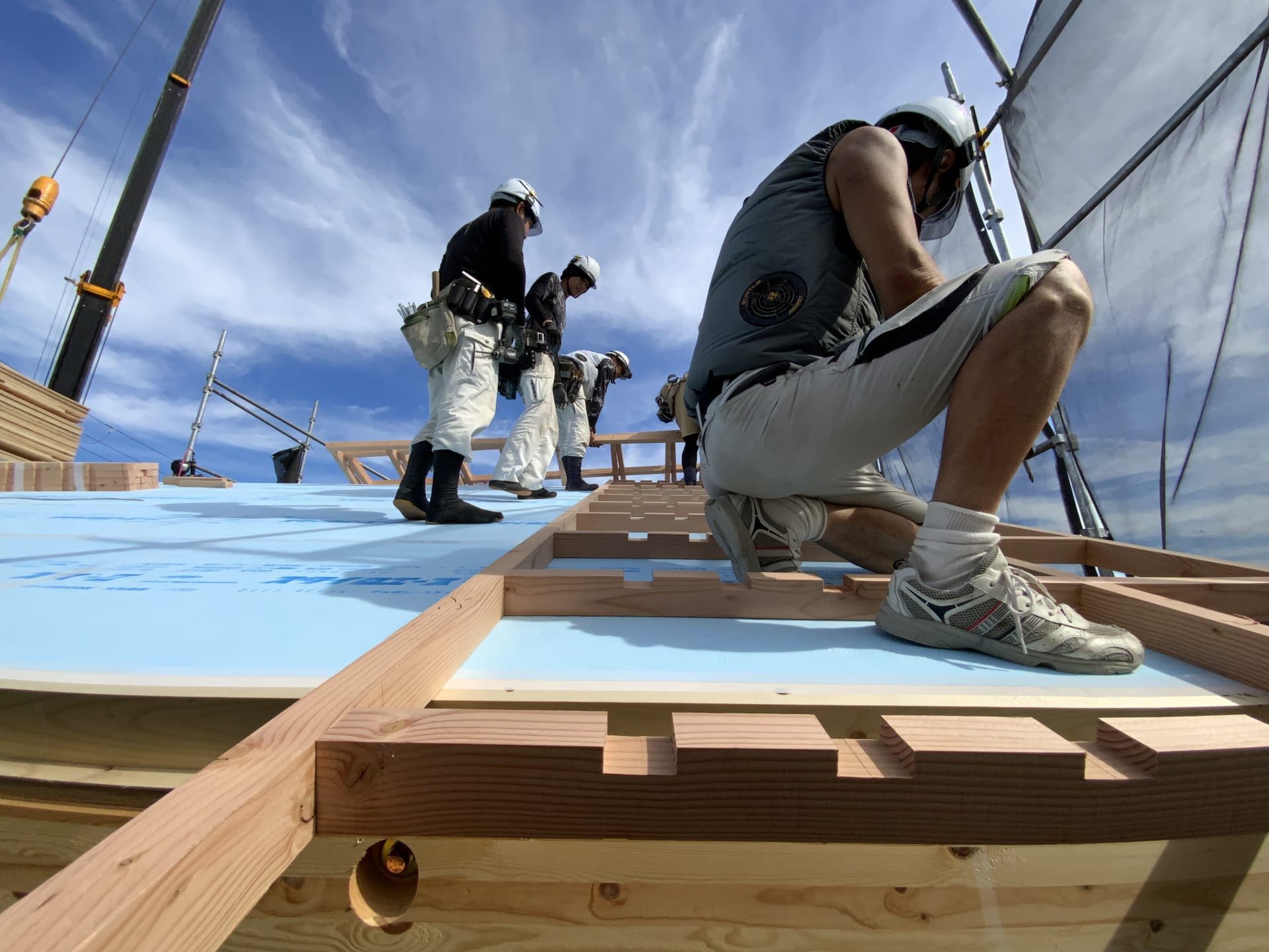 青い材料は屋根の断熱材ですが、これを外貼りにして隙間なく敷きこんでいきます。